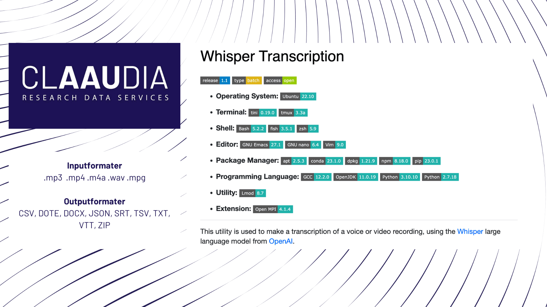 Du kan læse mere om Whisper Transcription på CLAAUDIAs hjemmeside her.
