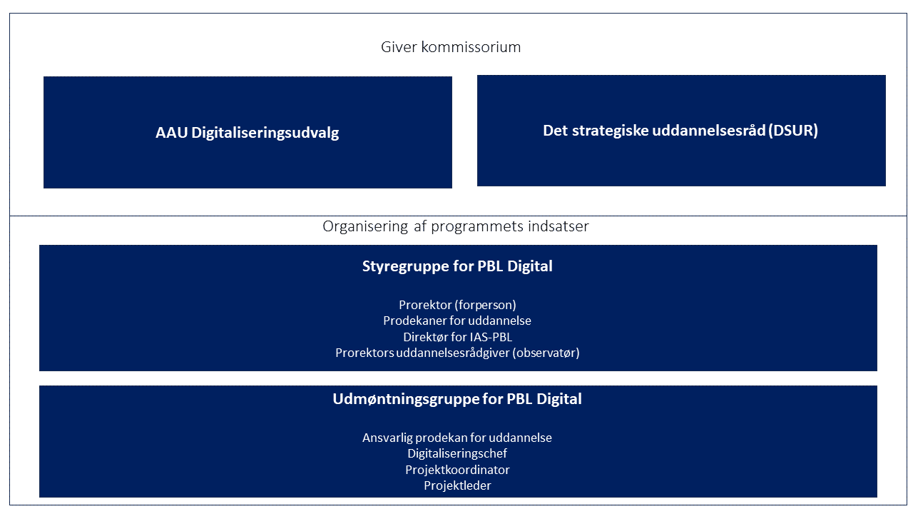 AAU Digitaliseringsudvalg fastlægger genstandsfeltet for PBL Digital. Det Strategiske Uddannelsesråd (DSUR) er programejer og PBL Digital rapporterer således til DSUR.
