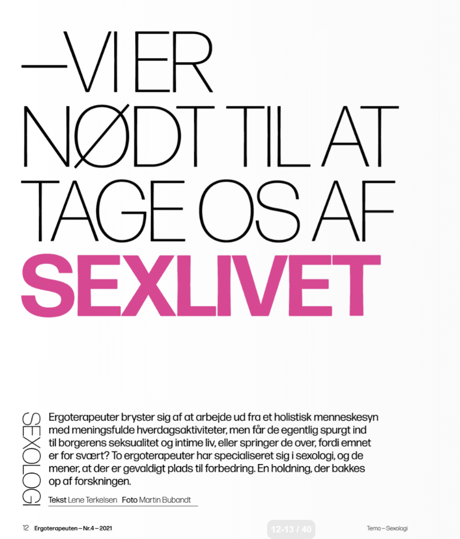 I et nyere befolkningsstudie fandt mere end otte ud af ti voksne danskere, at det er vigtigt at have et godt sexliv, og det er vist, at aktiv inddragelse af seksuelle aspekter i det sundhedsfaglige arbejde kan medvirke til at forebygge mistrivsel samt styrke livsmod og mestring hos funktionshæmmede og kronisk syge.