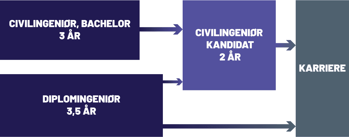 Du kan vælge imellem at uddanne dig civilingeniør eller diplomingeniør. Civilingeniøruddannelsen består af en 3-årig bachelorudddannelse og efter efterfølgende en 2-årig kandidatuddannelse. Diplomingeniøruddannelse er på 3½ år, hvorefter du kan gå direkte ud i job.
